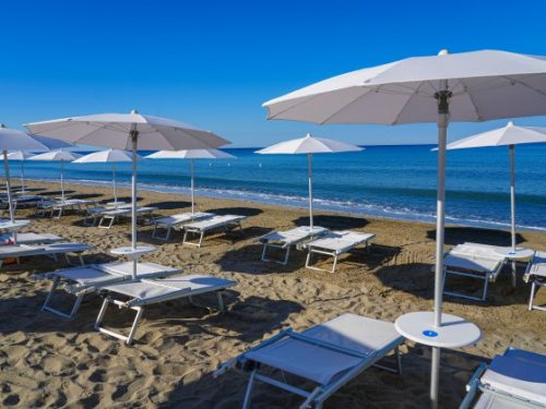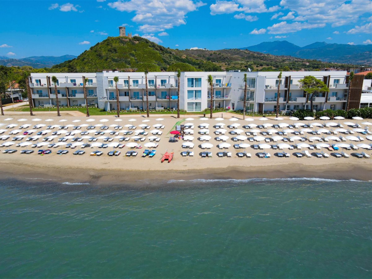 Direttamente sul mare, spiaggia di sabbia fine, attrezzata. Servizio spiaggia incluso nella Club Card (1 ombrellone + 2 lettini a camera) a partire dalla 2° fila.
