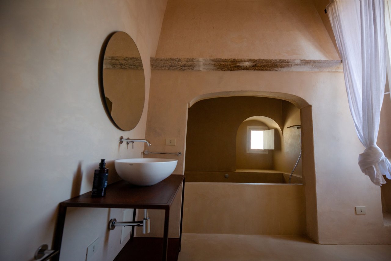 La masseria dispone di nove camere, arredate nel rispetto dello stile originario delle antiche dimore rurali pugliesi. Materiali naturali, dettagli architettonici autentici e tonalità calde definiscono ambienti intimi e raffinati, dove la luce naturale valorizza ogni spazio. Tutte le sistemazioni sono dotate di Wi-Fi gratuito, aria condizionata, frigobar e cassaforte; alcune camere offrono patio esterno privato e ingresso indipendente, garantendo maggiore riservatezza e un contatto diretto con il paesaggio circostante. I bagni, curati nelle finiture, dispongono di docce idro-emozionali pensate per un’esperienza di benessere personale.